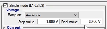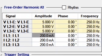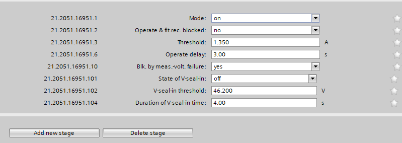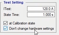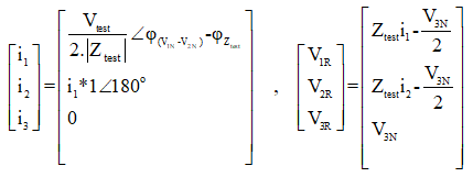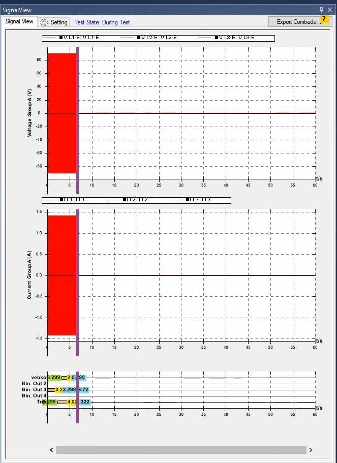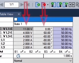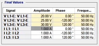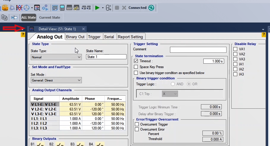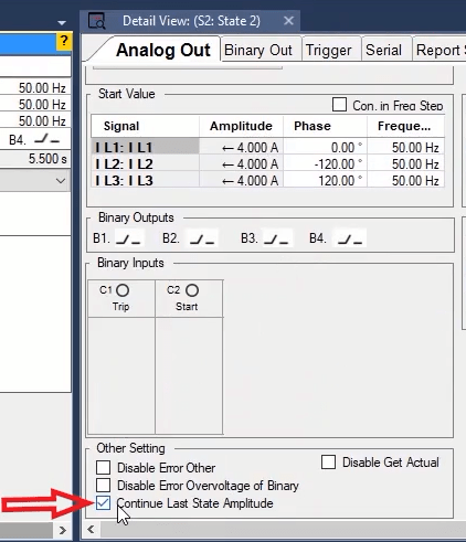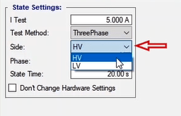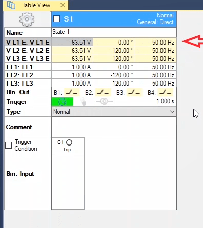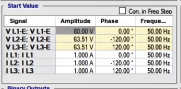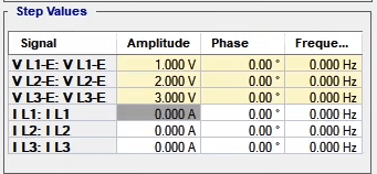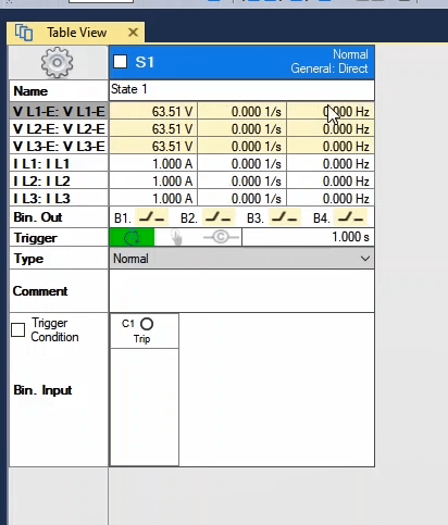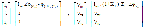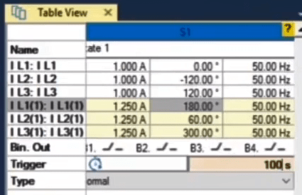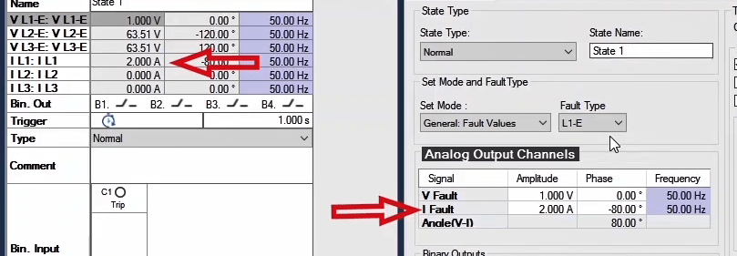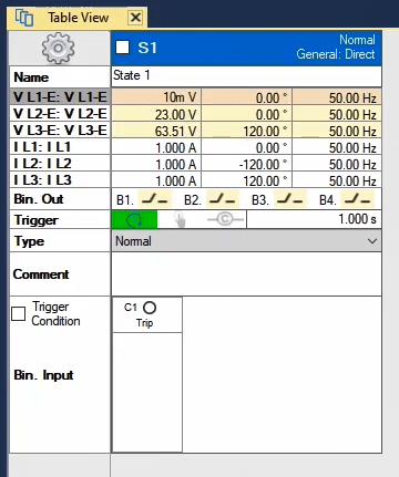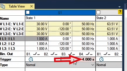 In the second state, the fault conditions are applied and the current is selected for all phases of L1E-L2E-L3E in the range of 2 to 4 times the nominal current. The duration of this state should be greater than the nominal time of the relay trip.
