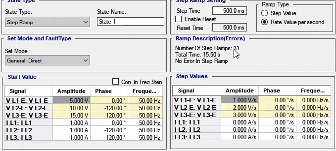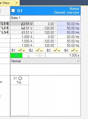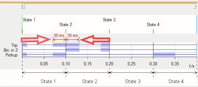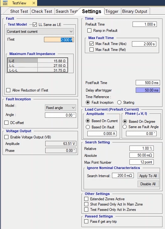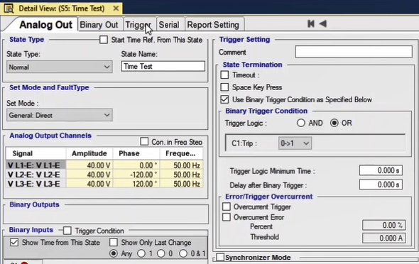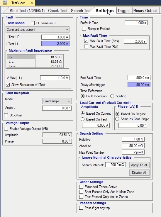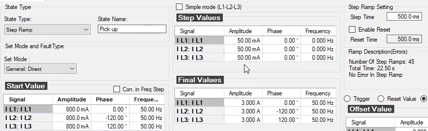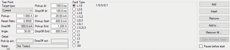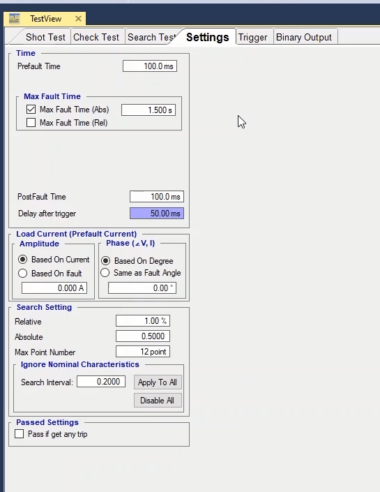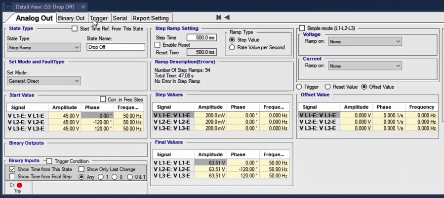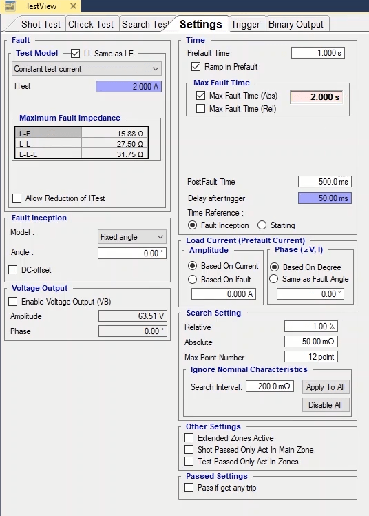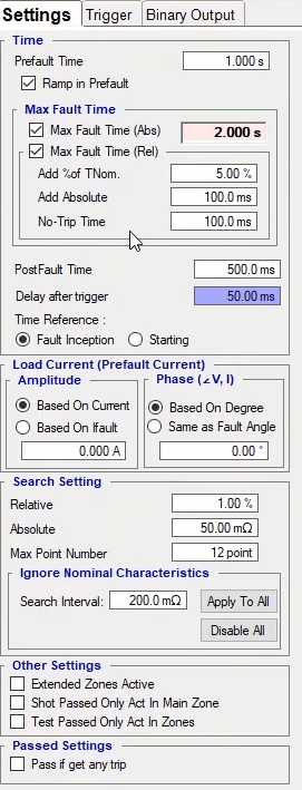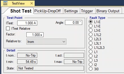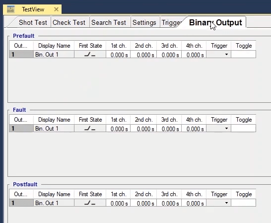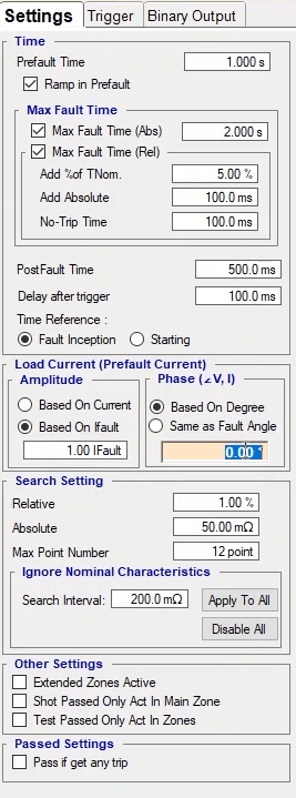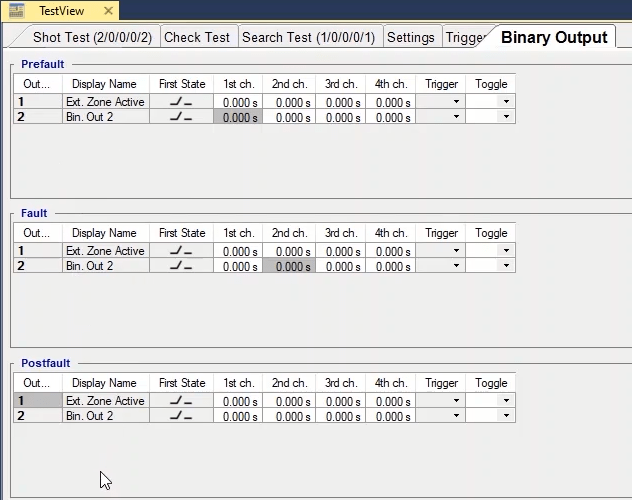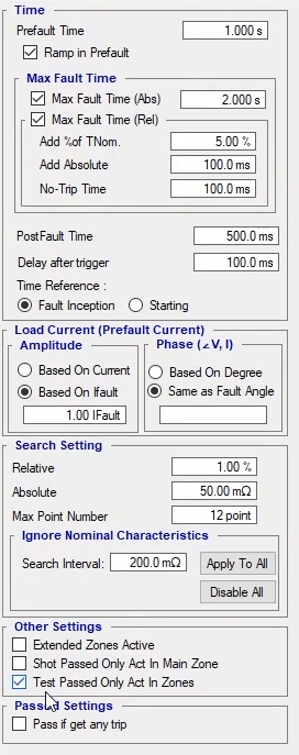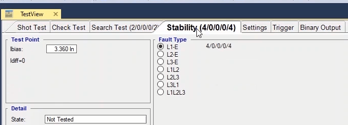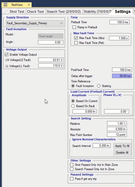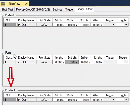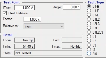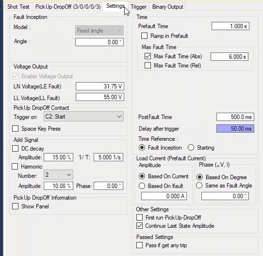 To perform this test three states ones including PreFault, Fault and PostFault are required. PreFault time is suitable for 500 milliseconds, fault time should be greater than the maximum trip time, and Post Fault time is at least 500 milliseconds. PostFault time should be increased if the drop-off is not instantaneous.