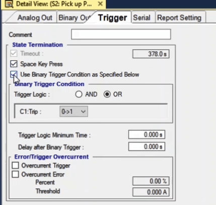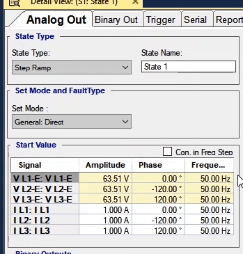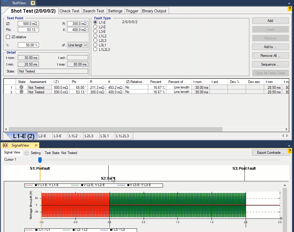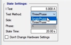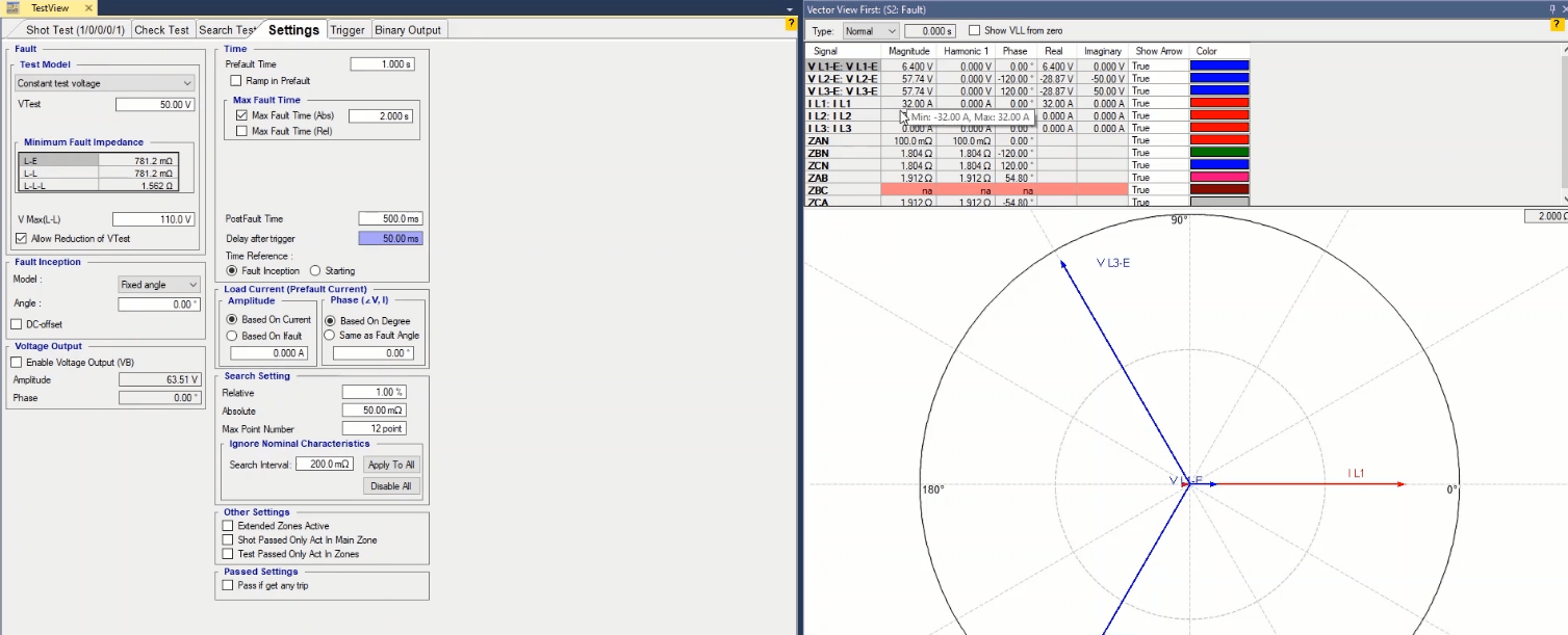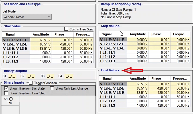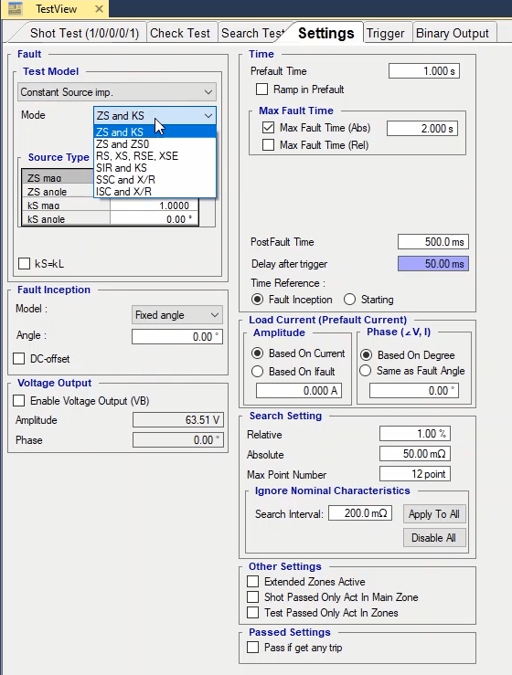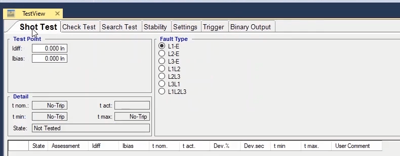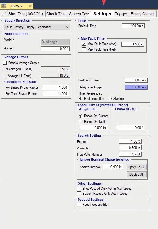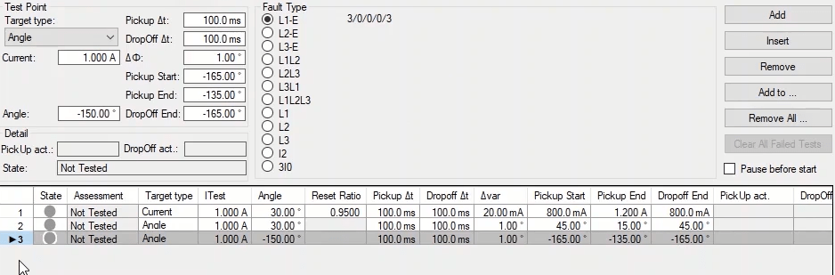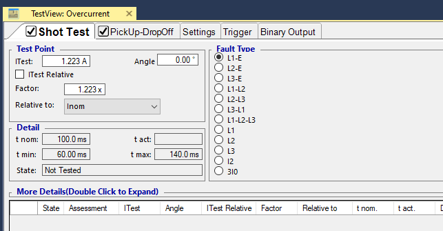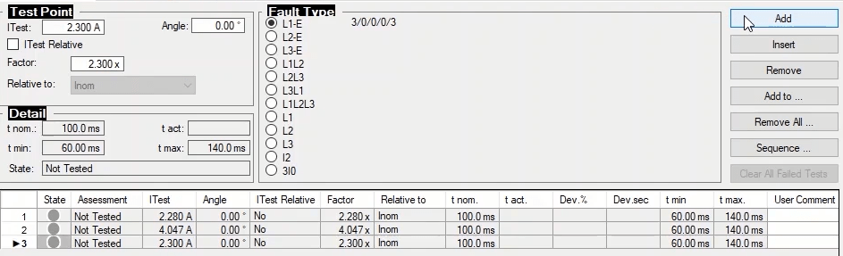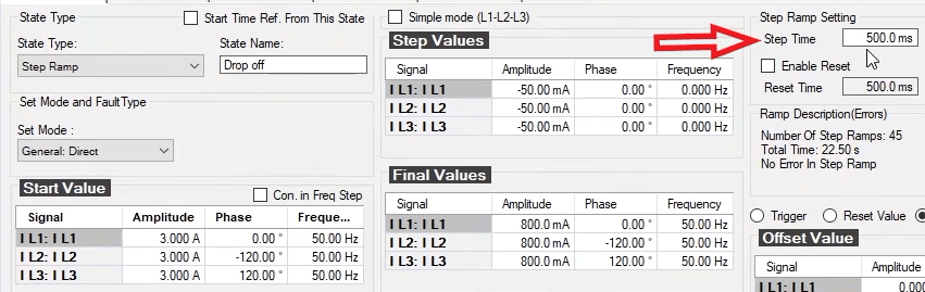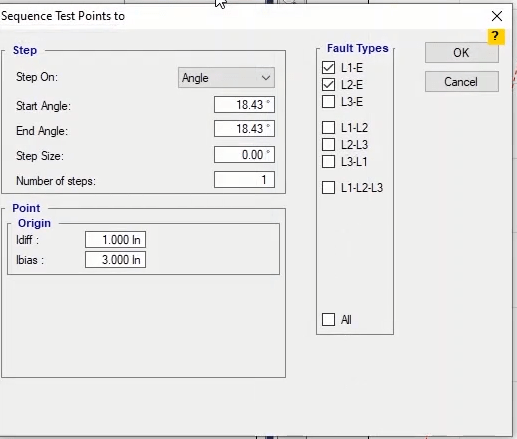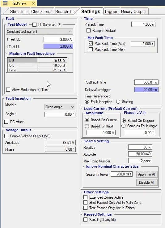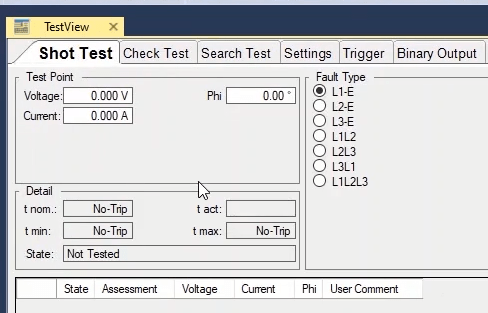 To perform this test three states ones including PreFault, Fault and PostFault are required. PreFault time is suitable for 500 milliseconds, fault time should be greater than the maximum trip time, and Post Fault time is at least 500 milliseconds. PostFault time should be increased if the drop-off is not instantaneous.