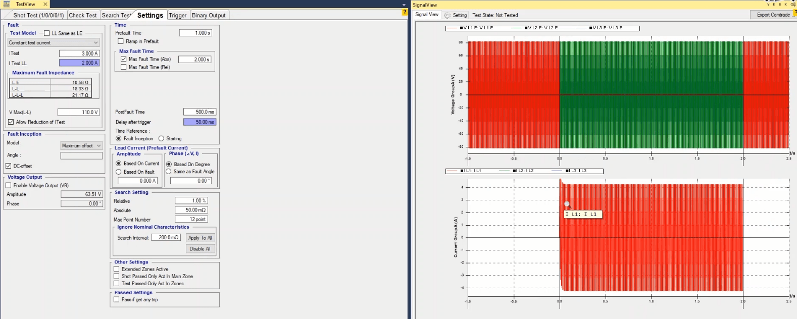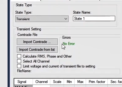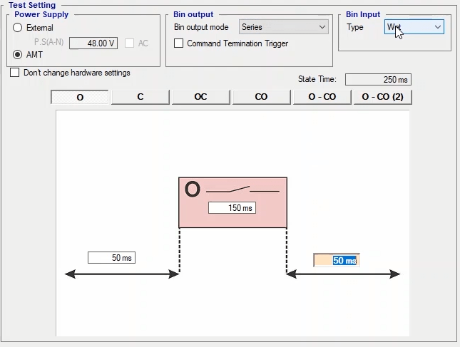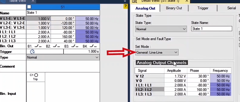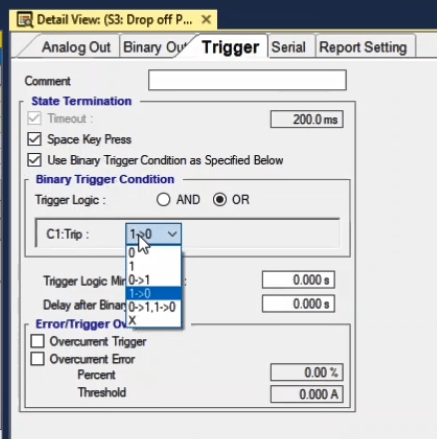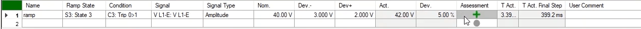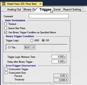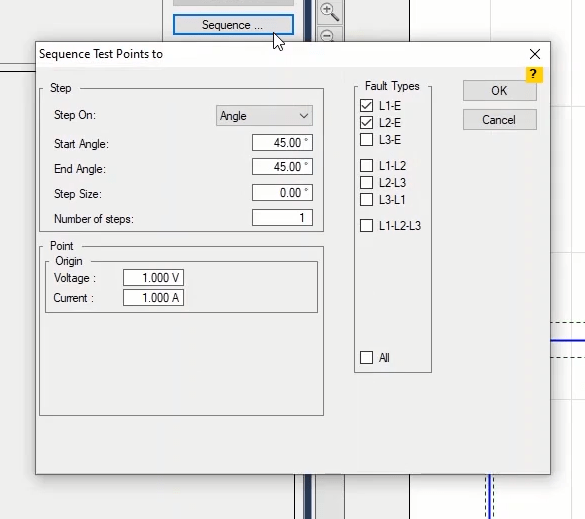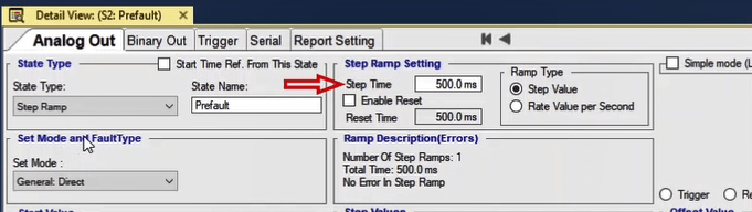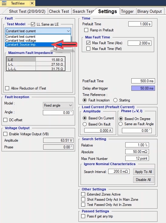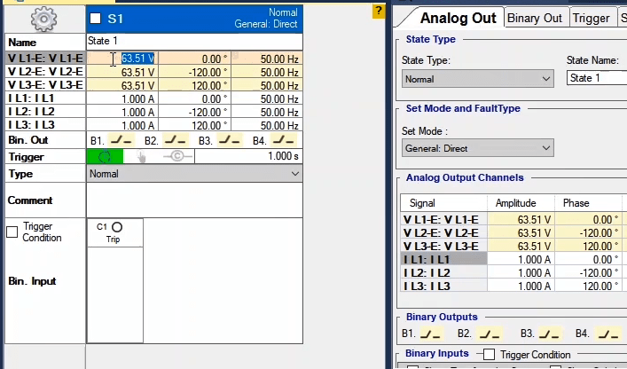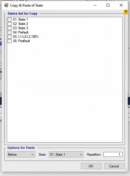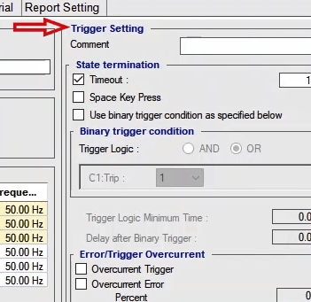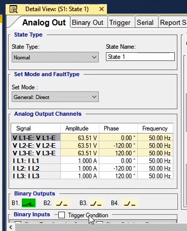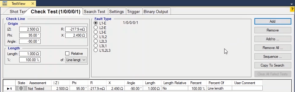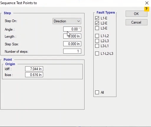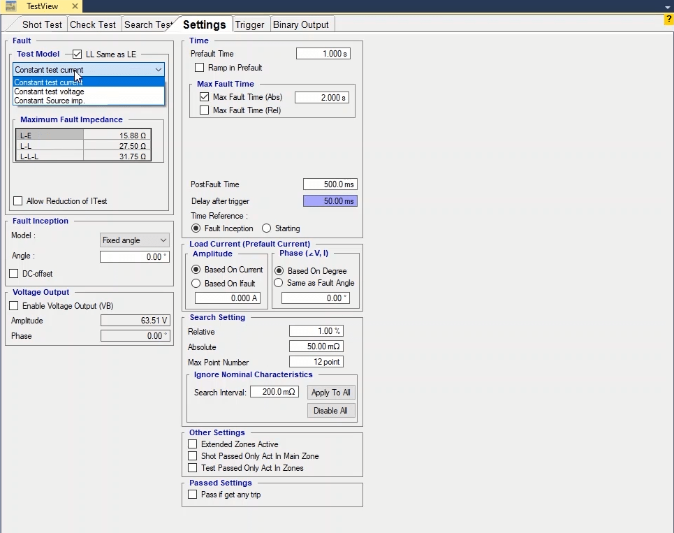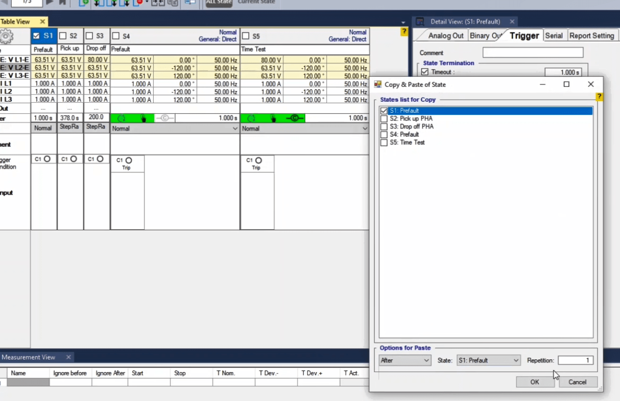 To perform this test three states ones including PreFault, Fault and PostFault are required. PreFault time is suitable for 500 milliseconds, fault time should be greater than the maximum trip time, and Post Fault time is at least 500 milliseconds. PostFault time should be increased if the drop-off is not instantaneous.