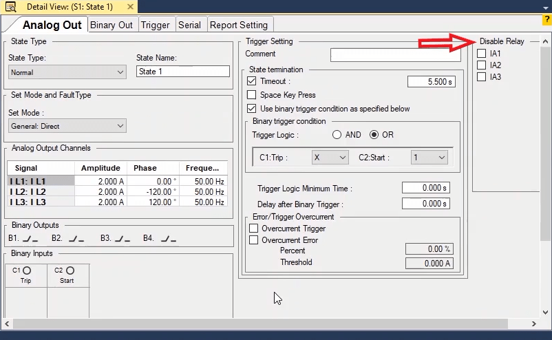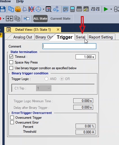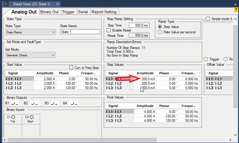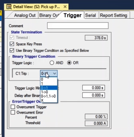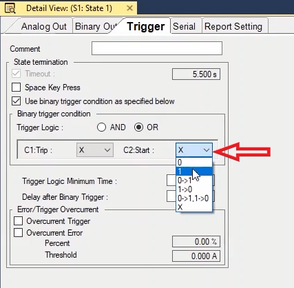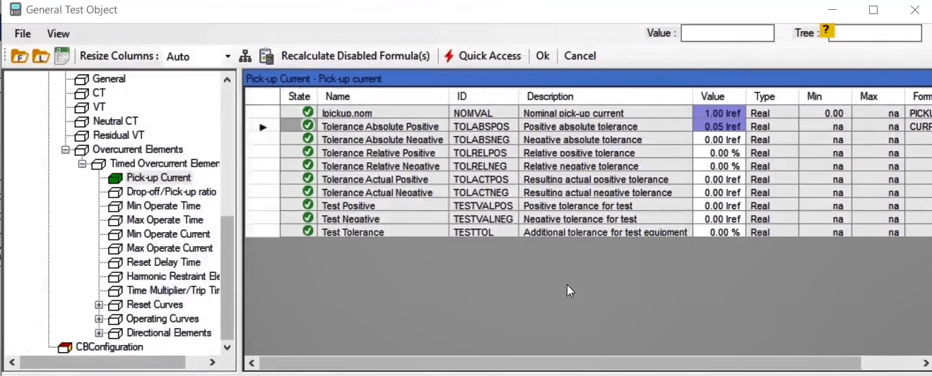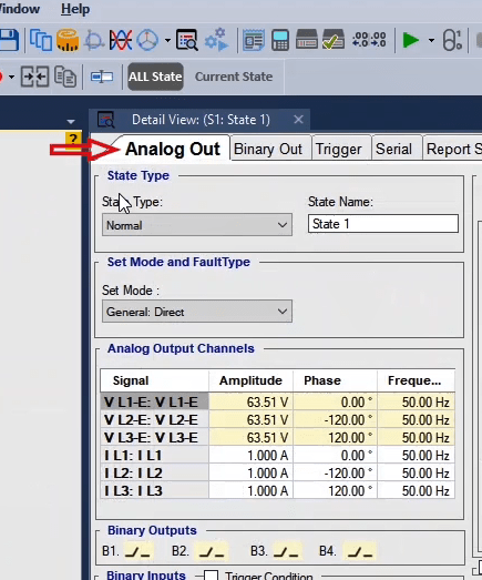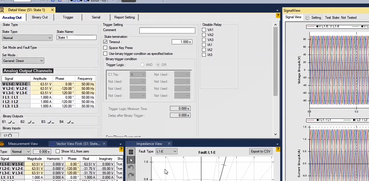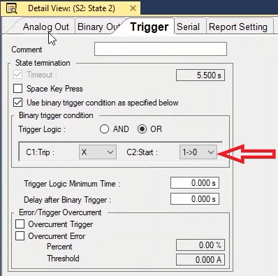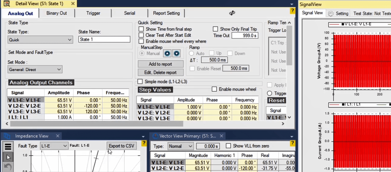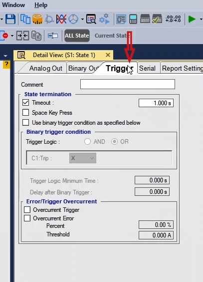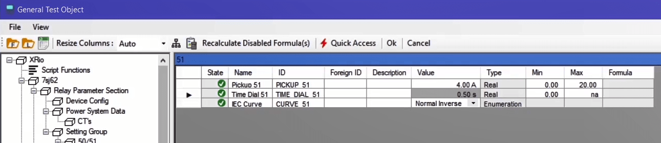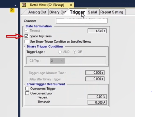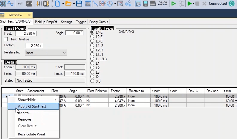 To perform this test three states ones including PreFault, Fault and PostFault are required. PreFault time is suitable for 500 milliseconds, fault time should be greater than the maximum trip time, and Post Fault time is at least 500 milliseconds. PostFault time should be increased if the drop-off is not instantaneous.