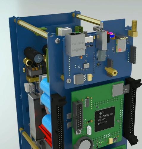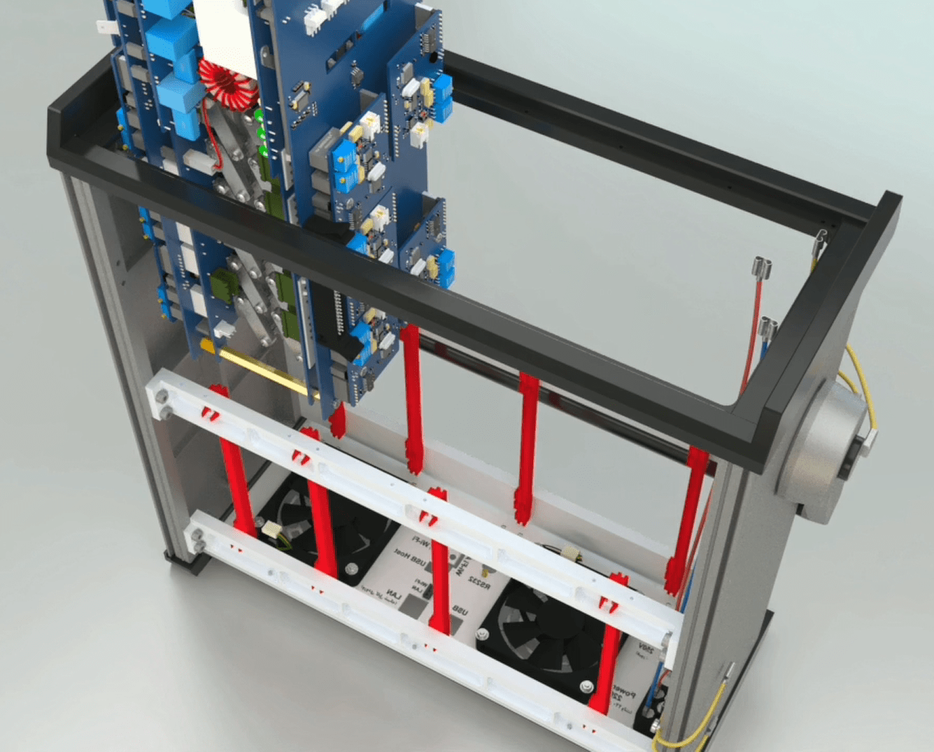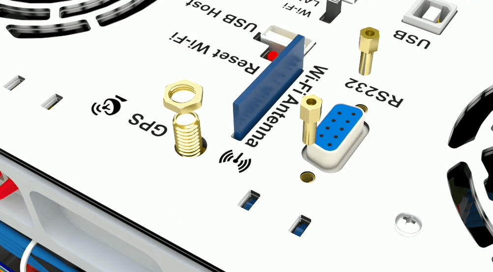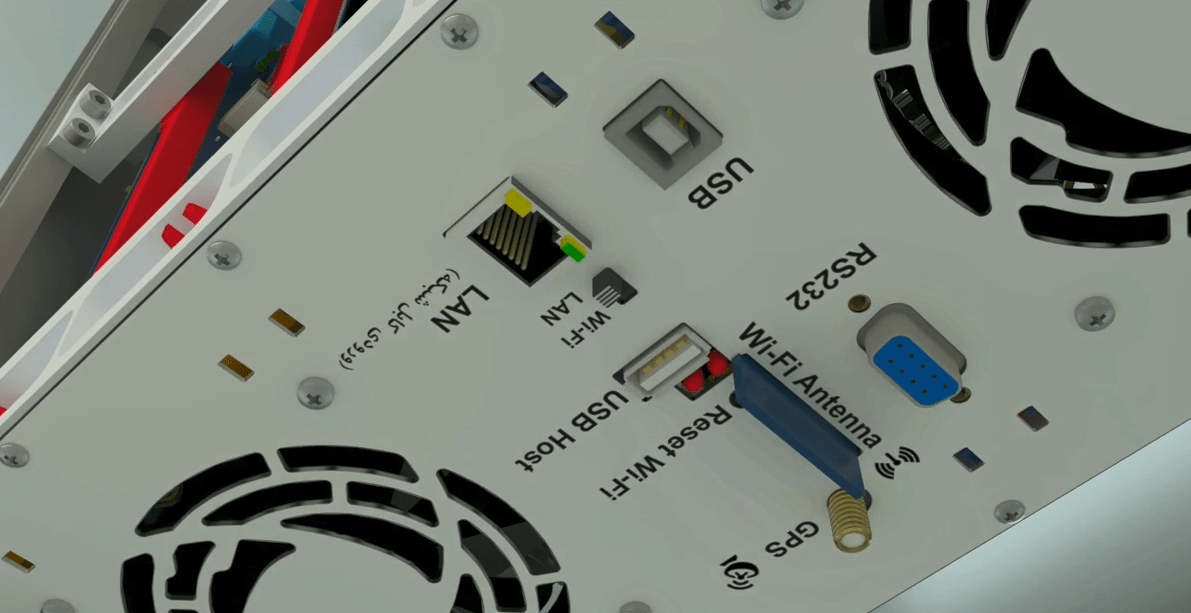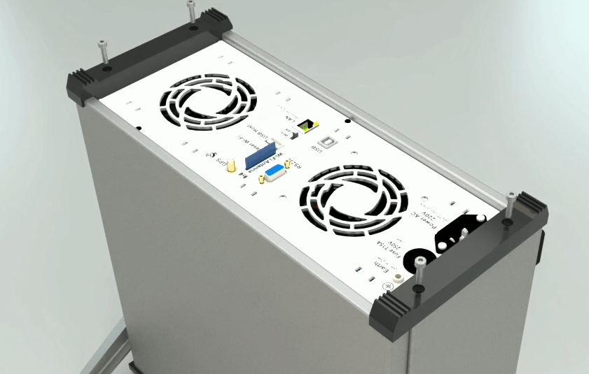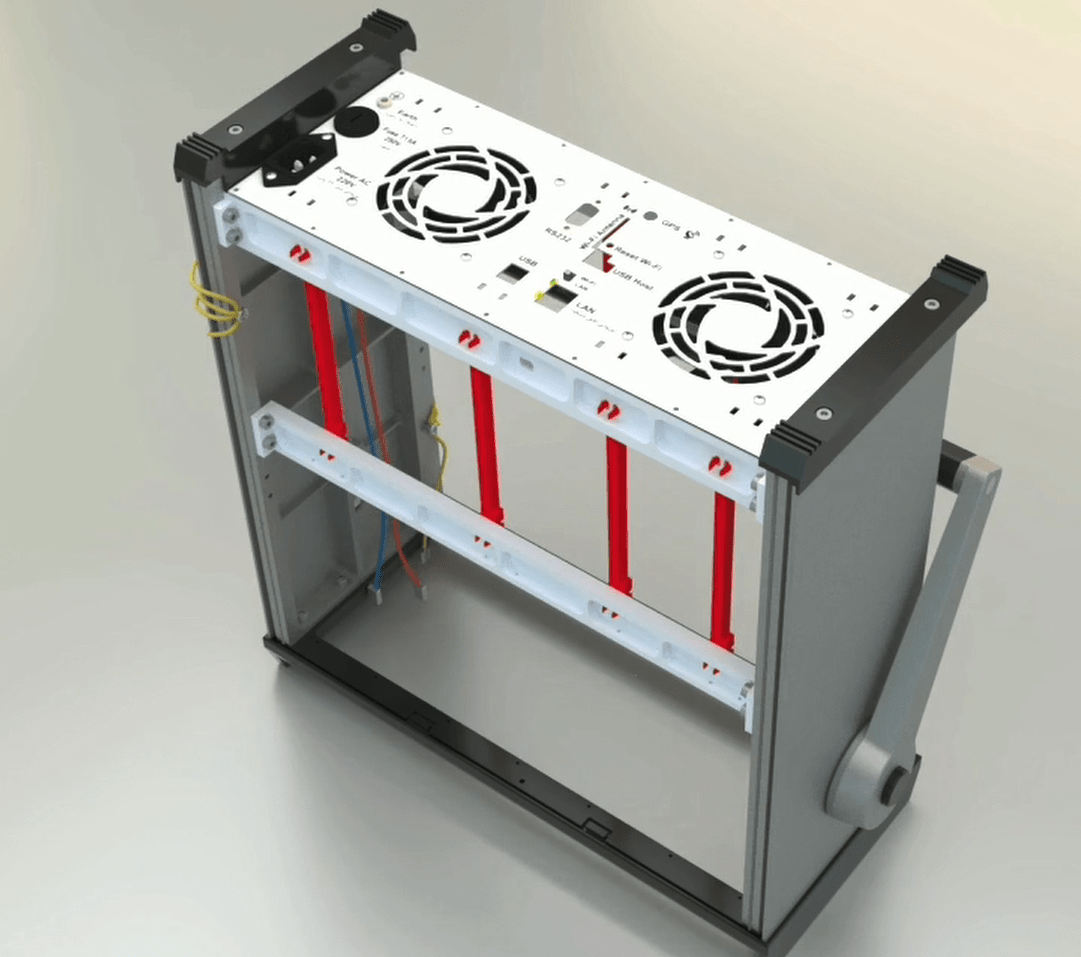 The incomplete side of the switching module (the one that only has a command board) should be on the side of the case’s wall, so that the Ethernet, USB, RS232, Wi-Fi and GPS ports are downward and placed in the rear panel.
