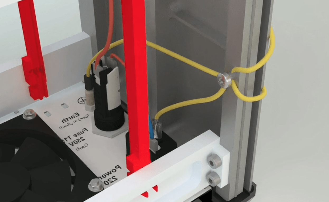 To assemble the device, you must first install the back panel on the case. Stand the case in front of you, in a way that the power socket is on your right side. Connect one of the earth wires to the power socket and the other one to the earth socket.