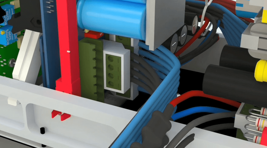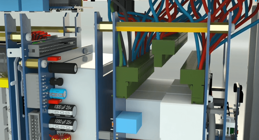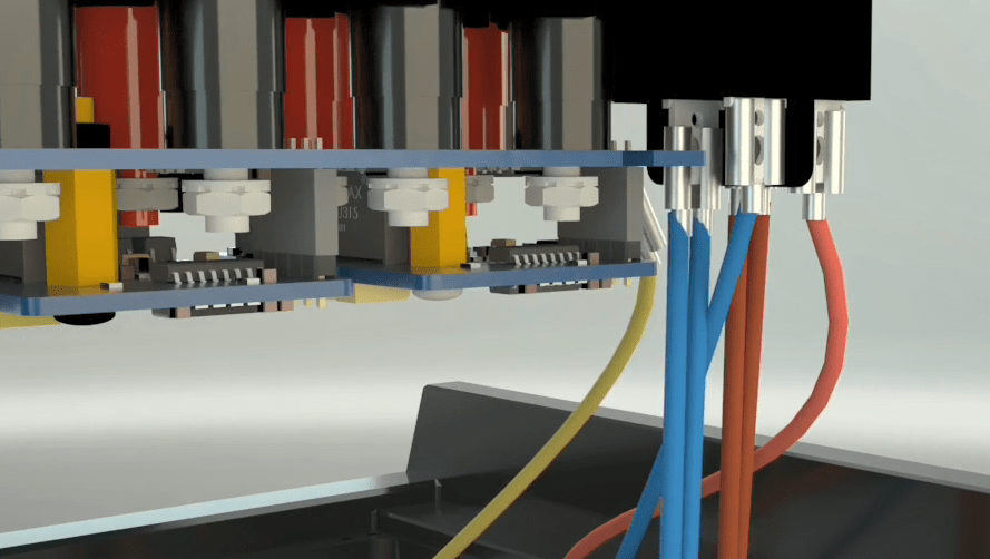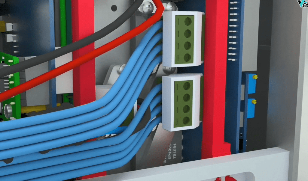 Connect the 4 pin blue longer Phoenix holder to the second male Phoenix from the bottom. Connect the 4 pin blue shorter Phoenix holder to the first male Phoenix from the bottom.