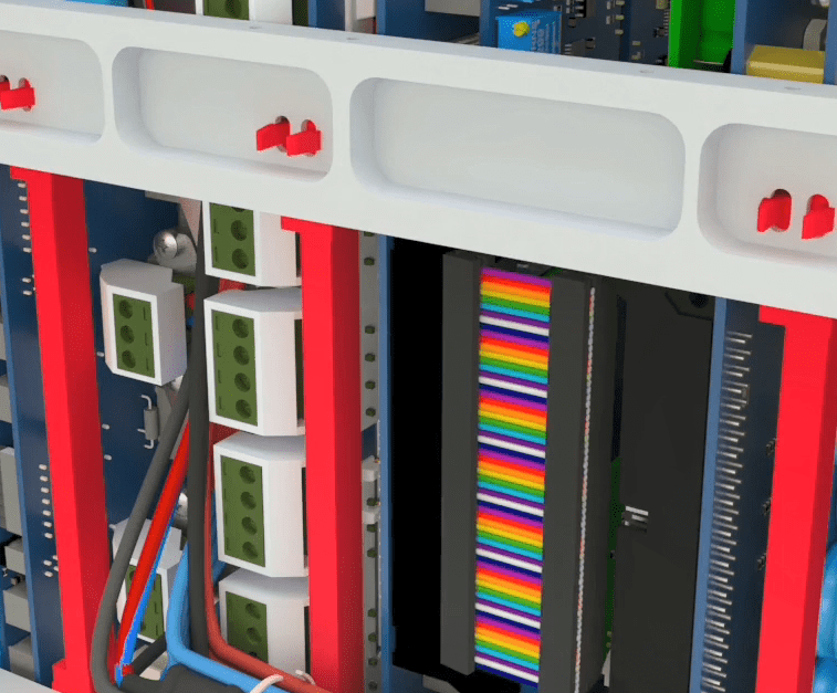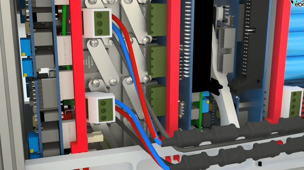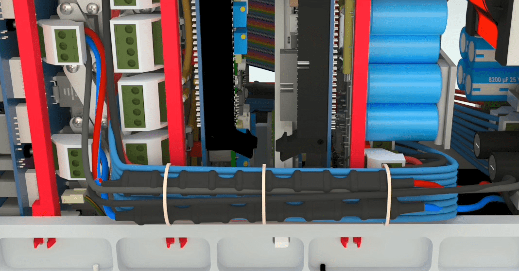 First, we remove the cable (earth). To remove the cables, you must first cut all belt clamps. Separate the holders attached to the phoenixes, then remove the latched flat cable by pressing the toggles.