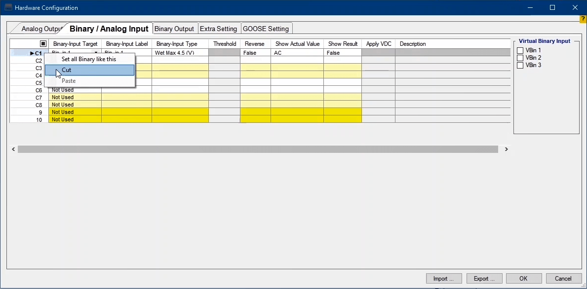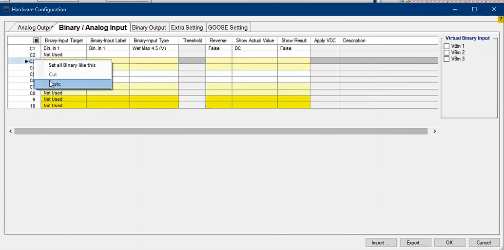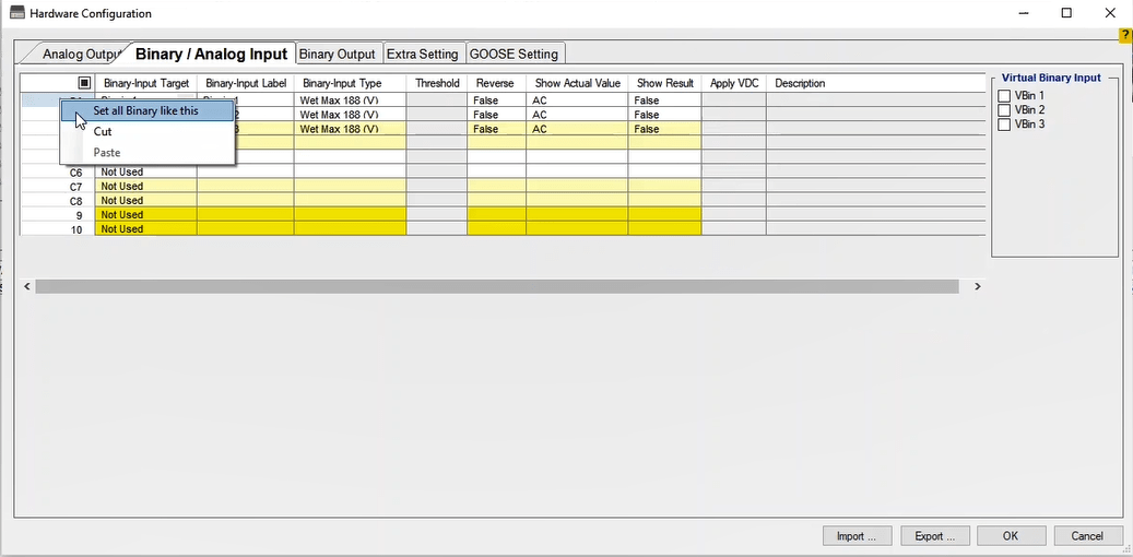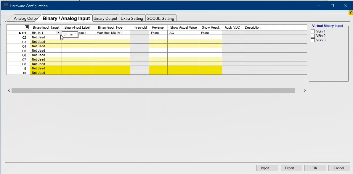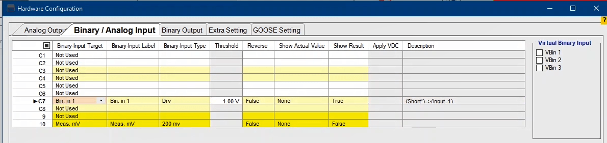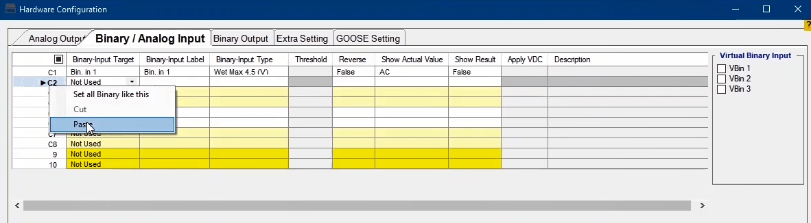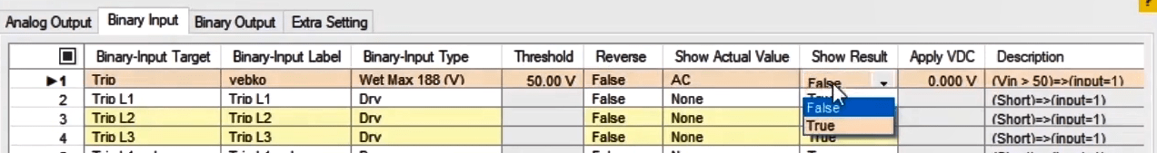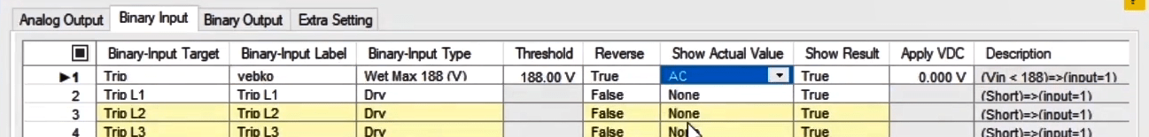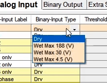 By choosing each option, related virtual Binary Input or Output will appear. After clicking on each binary, you will be directed to that page under Binary/Analog Input or Binary Output tab. Then you will be able to change the desired configurations.