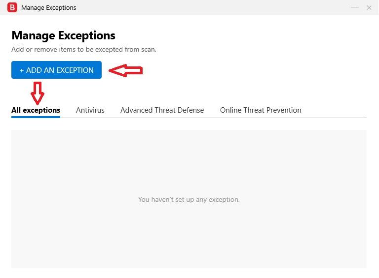 Select the All exceptions tab and select Add an exception option: