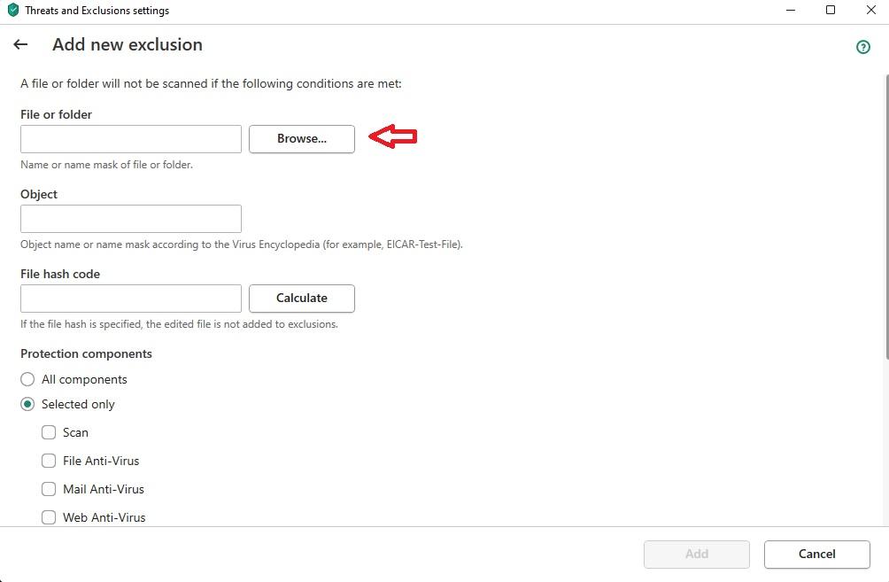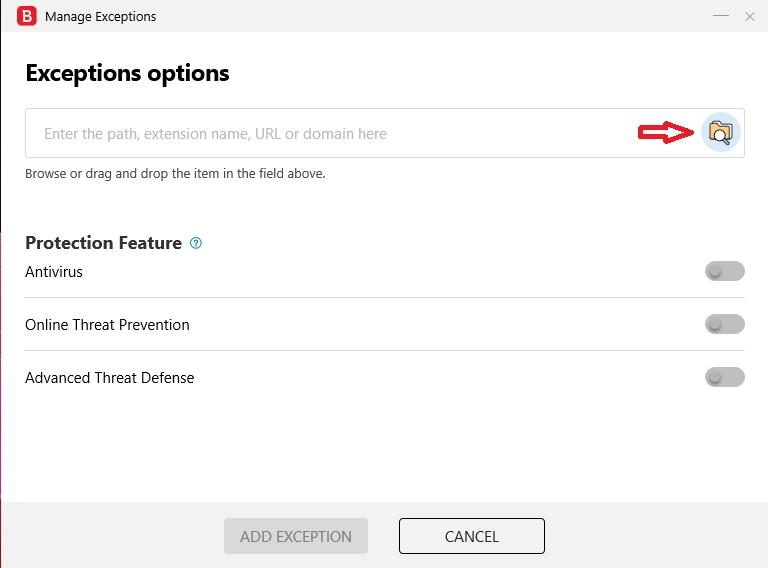 In the Add new exclusion window, click on Browse option: