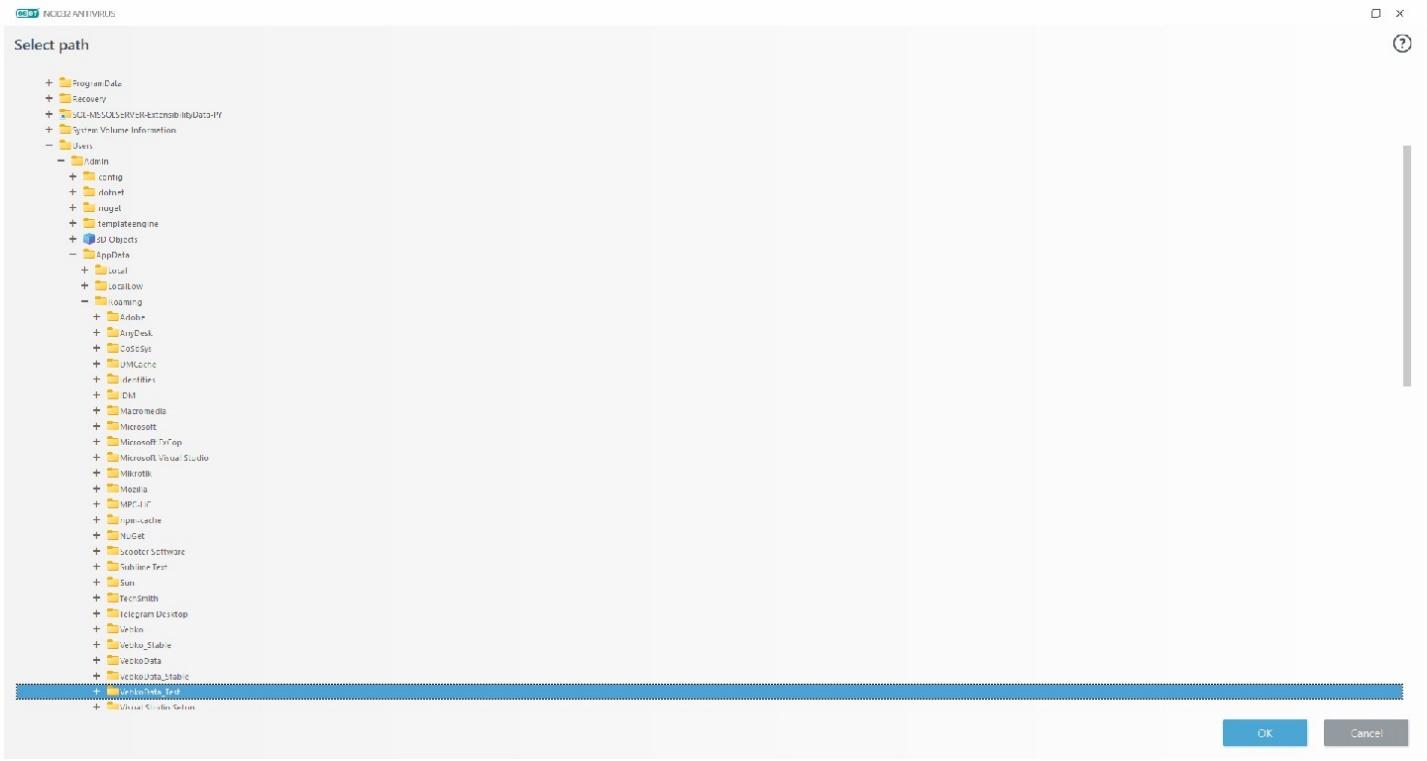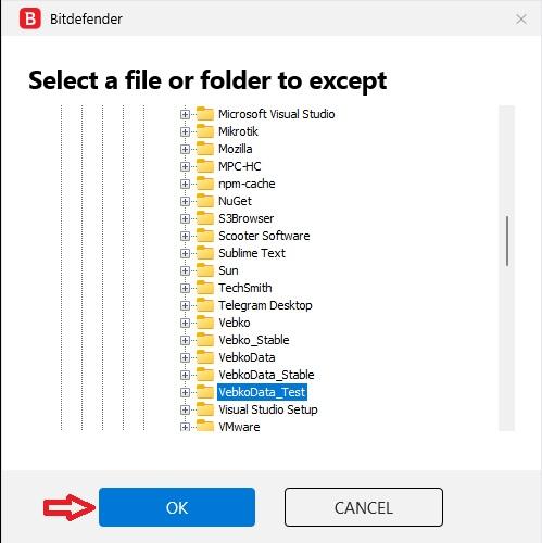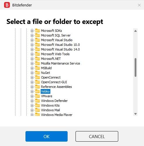 In the Select a file or folder to except window, specify the path to install Vebko software on the computer and select the software folder to be trusted: