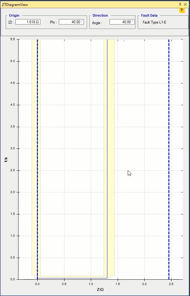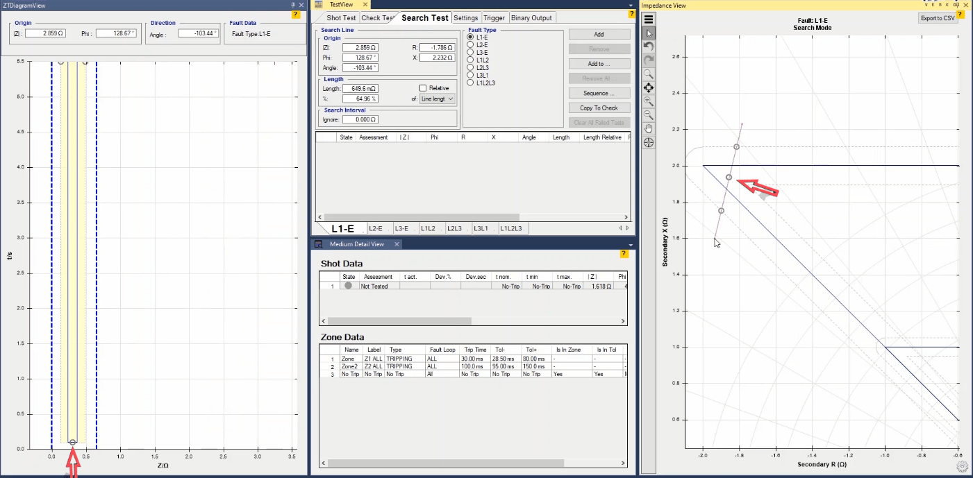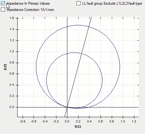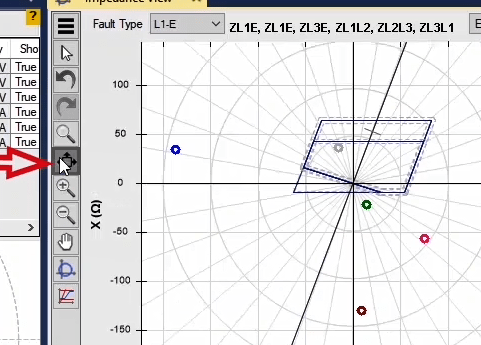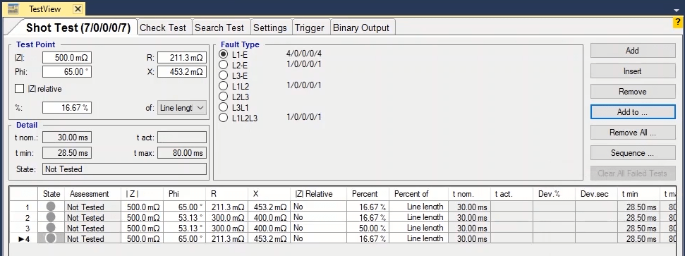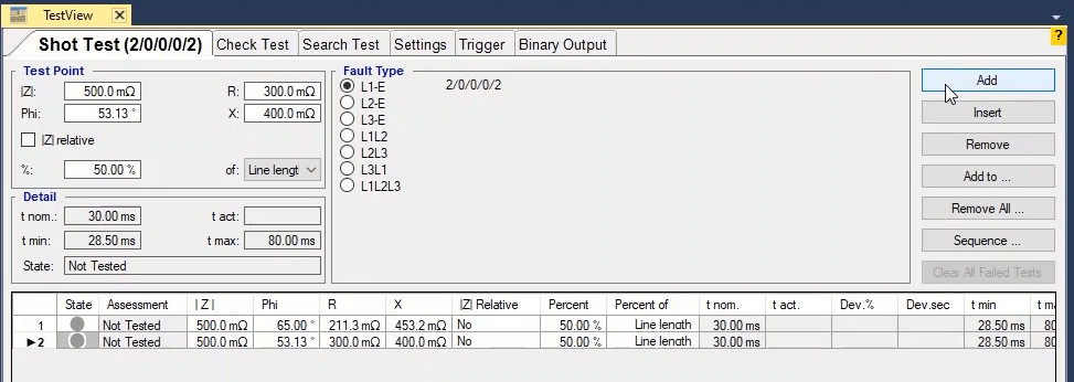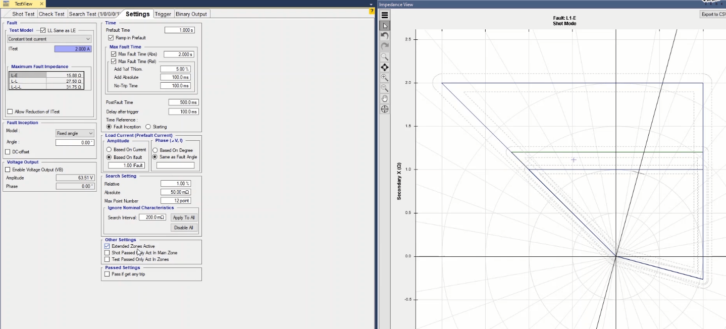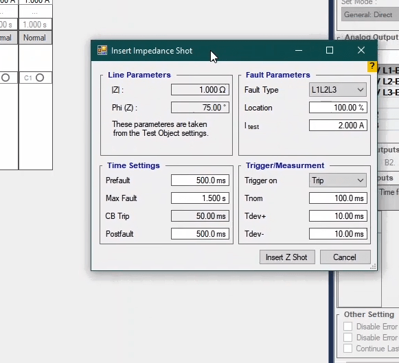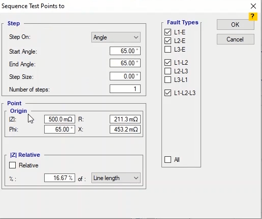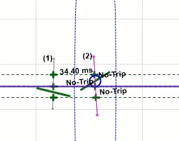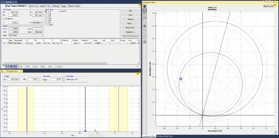 Firstly, shot test is performed, which aims to evaluate the time of different tripe zones. The Pre Fault value is at least 1 second and the Post Fault value is at least 500 milliseconds. In order to perform this test, we place points on 80% of the value of each zone in line with the real axis and also in line with the angle of the line.