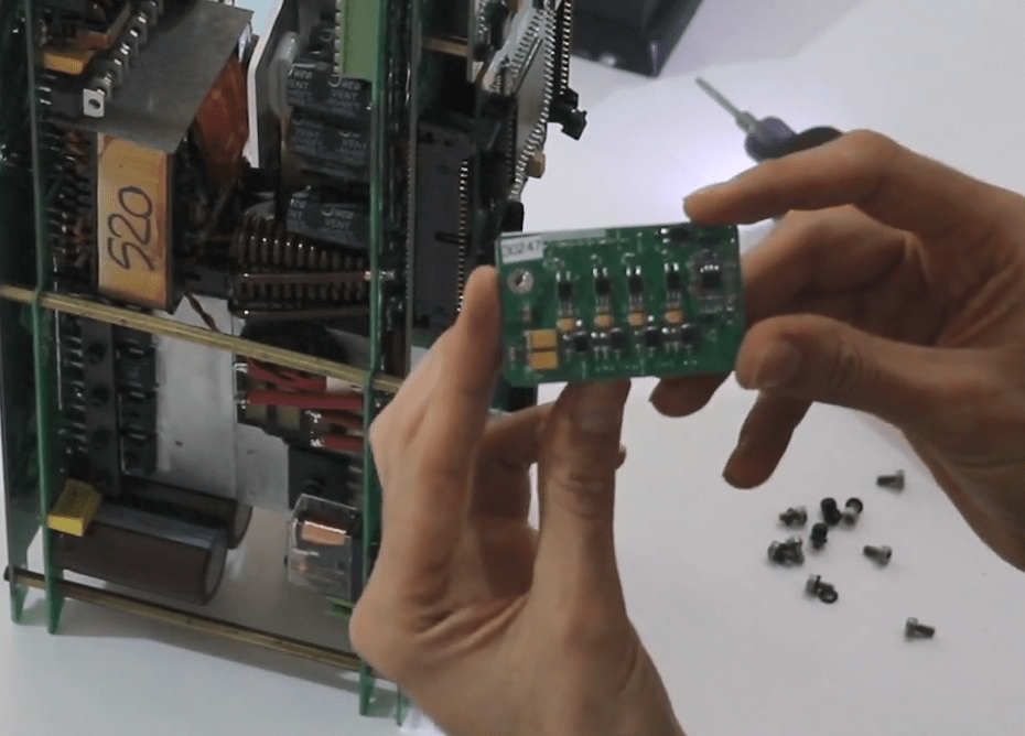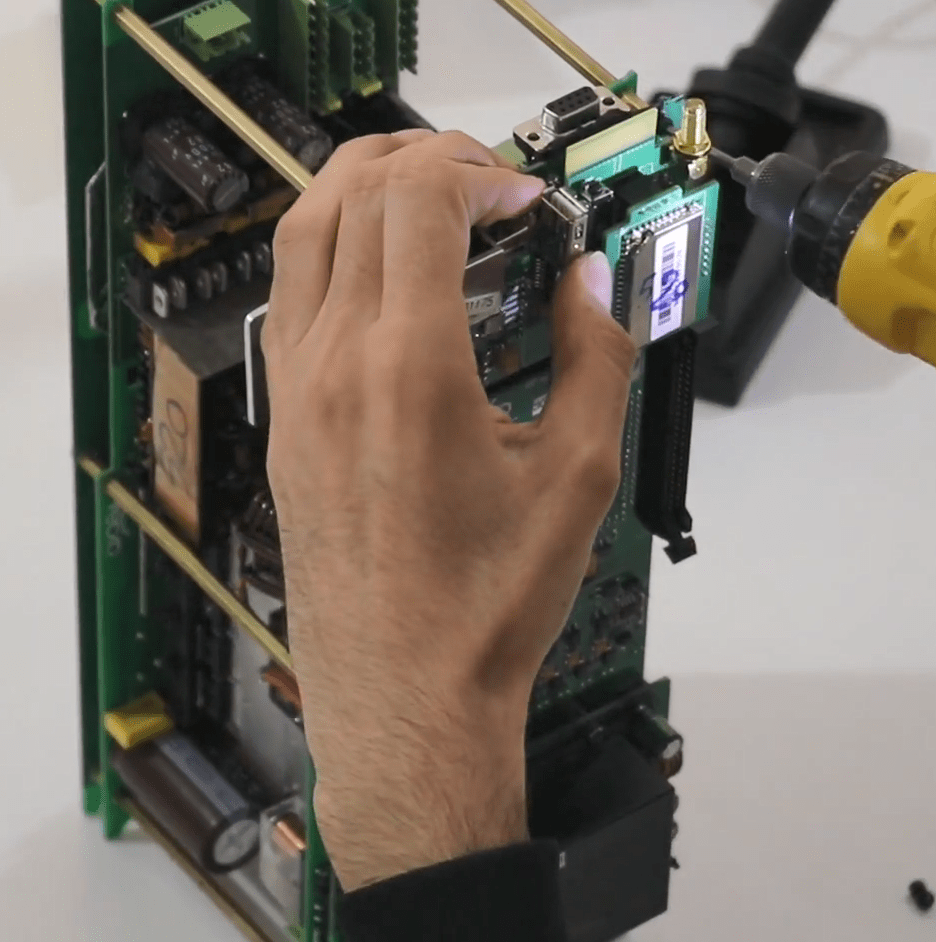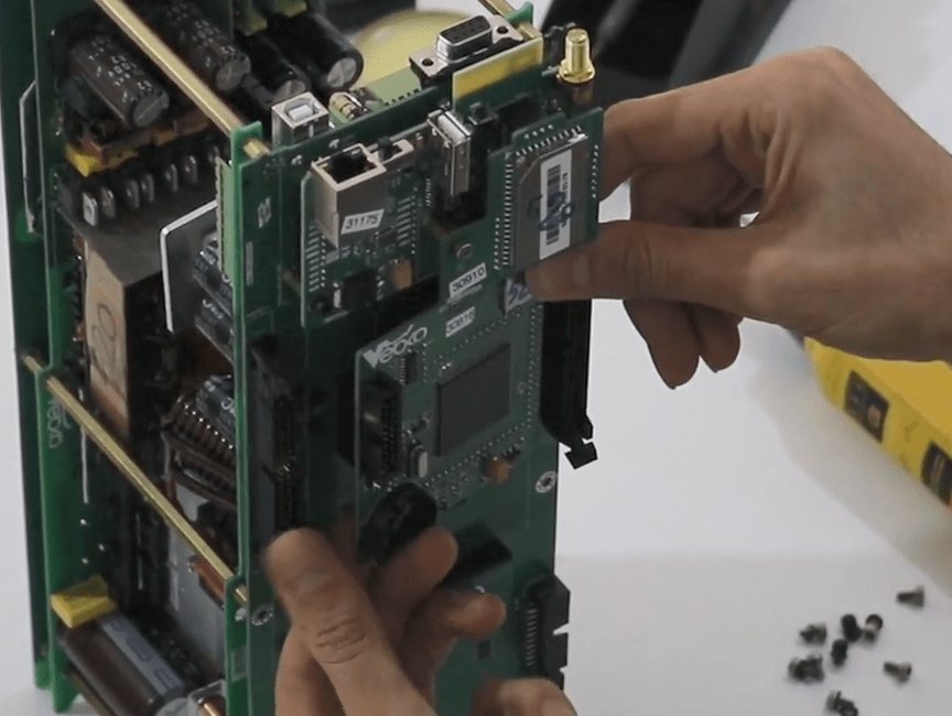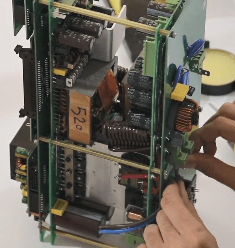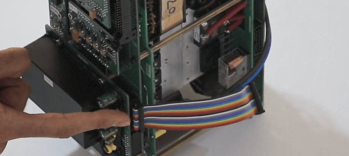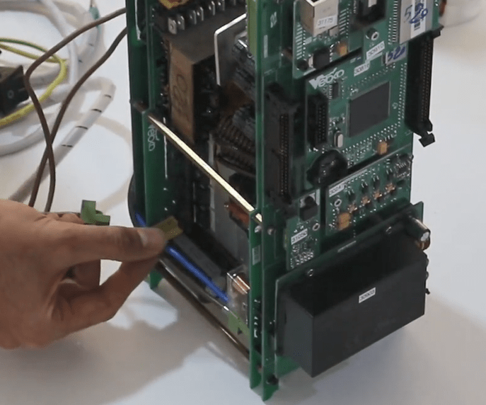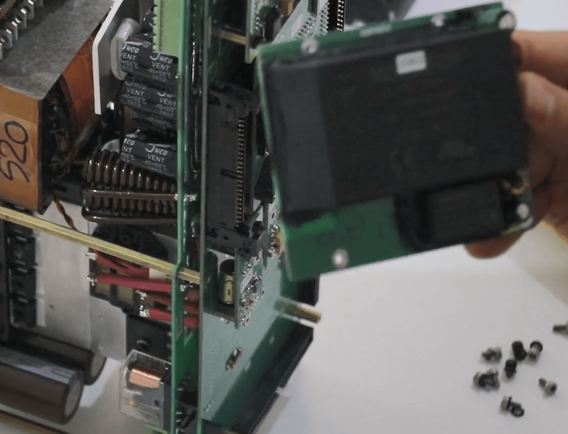 Now open the 14 screws in the front panel then release the green connectors attached to the panel (Phoenix).