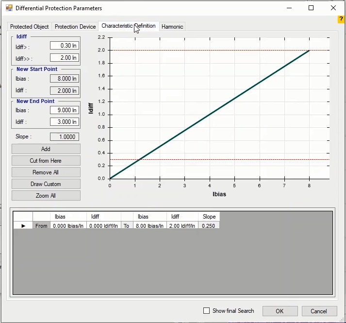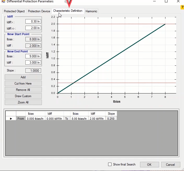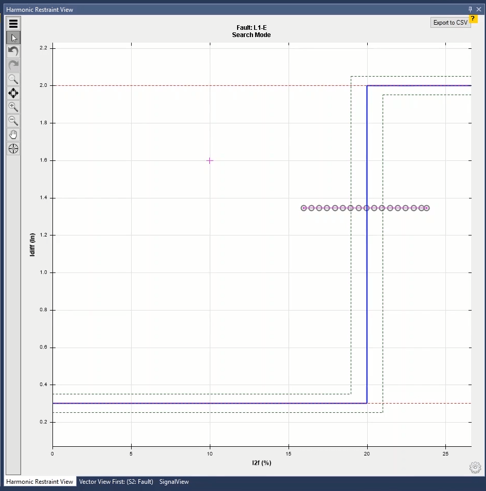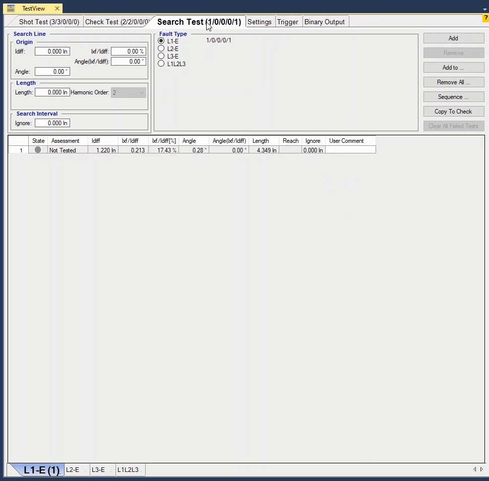 In the next step, by using Search Test, we evaluate the real curve of differential protection performance. According to the system, in search test, at least two search lines should be selected on the performance curve for each part of the curve slope, one of these lines is better to be in the characteristic fracture area. This test is performed in fault types L1-E, L2-L3 and L1L2L3.