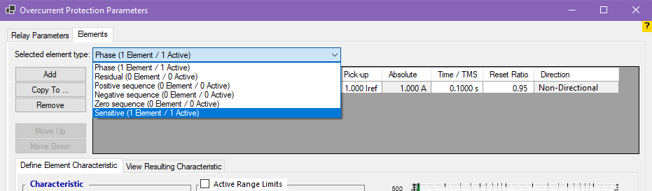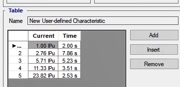 By double-clicking on the Negative Sequence block, the settings for its various stages are visible. Here, the first stage with normal Inverse setting characteristic has a current of 0.1 amps, the TMS equals 1, and the two constant time stages with a current setting of 0.2 and 0.5A have a time setting of 1.5 and 0.5 seconds, respectively.