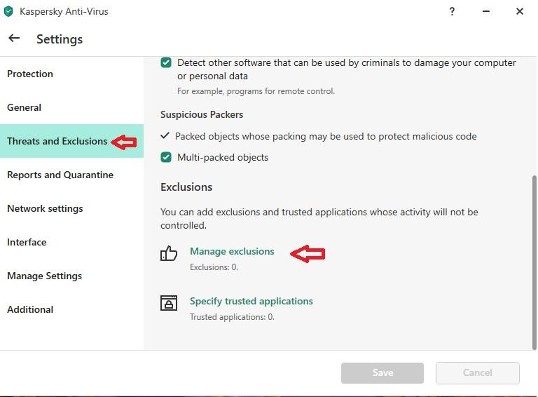 Then, in the Threats and Exclusions tab, select Manage exclusions:
