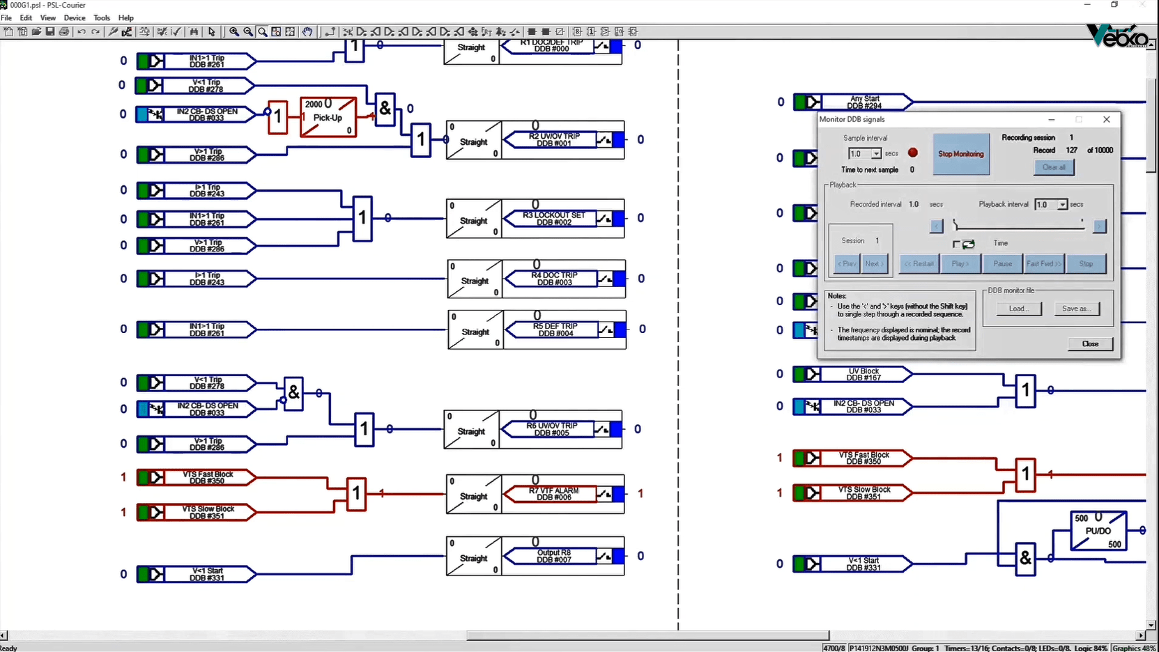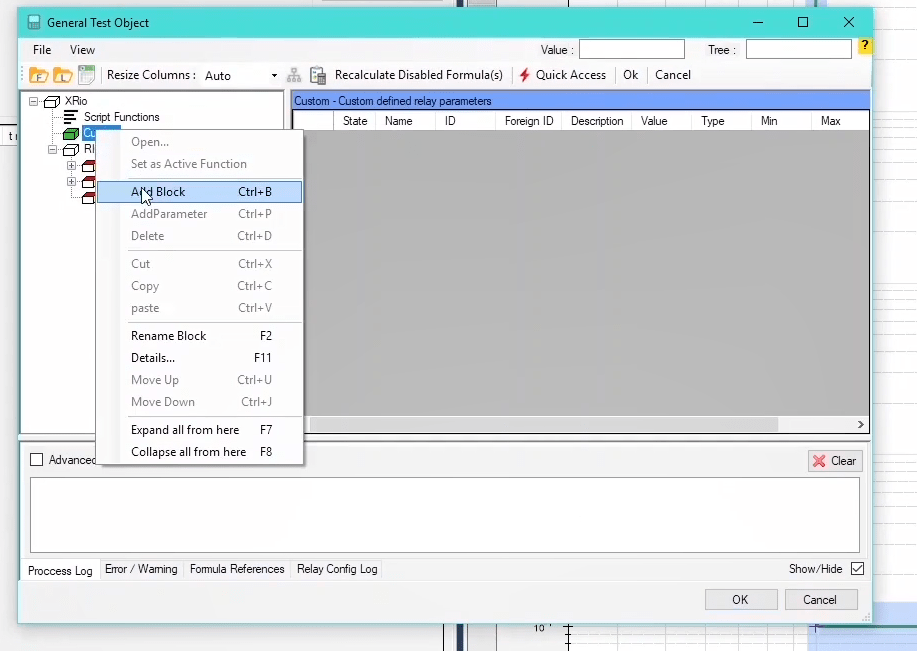 Here the directional overcurrent function displayed with the name OC 67 is selected. In Configuring, this function uses an OC Inverse block and two OC Definite blocks that have different settings and the signals of a current card are assigned to their input (from a measuring point). Finally, output signals are assigned to Binary Outputs and relay LEDs by Output and LED blocks. To change the settings, simply right-click on each block to access a set of options. Finally, the changes are sent to the relay.