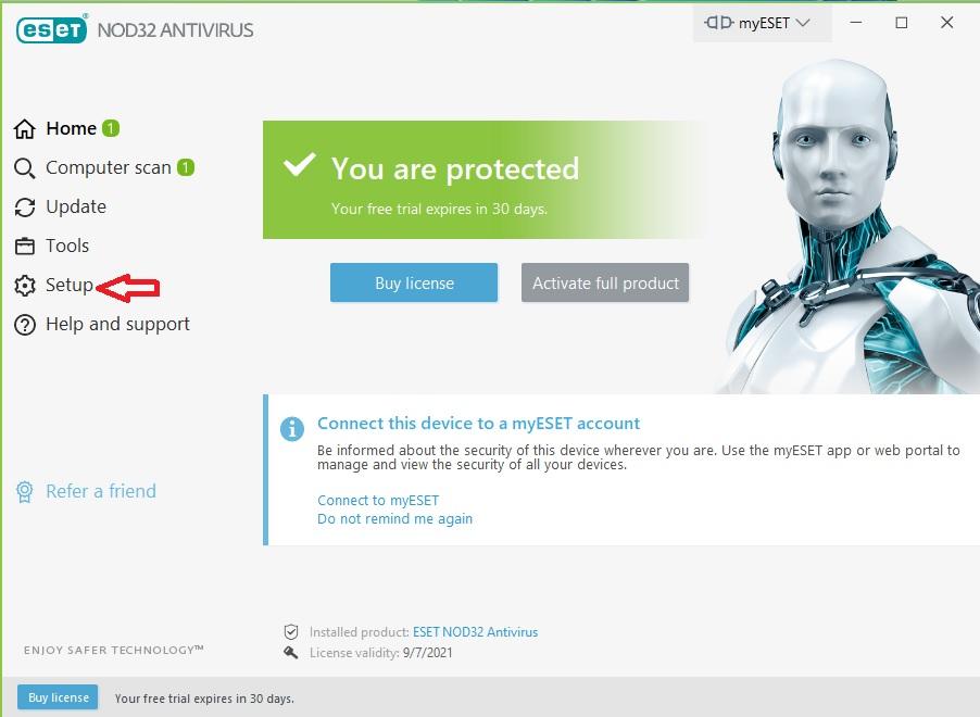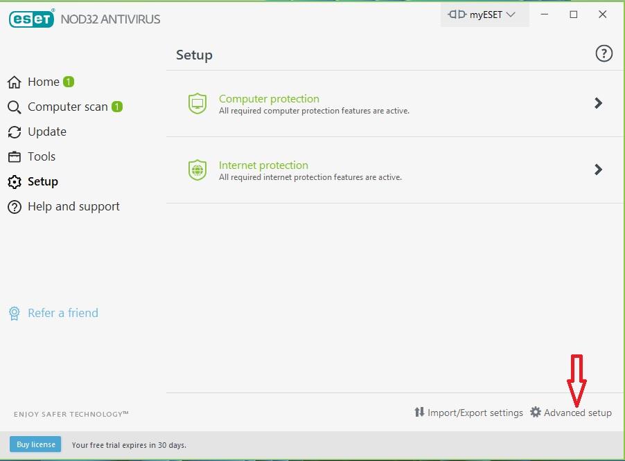 First, enter setup section and then the antivirus Advanced setup option:
