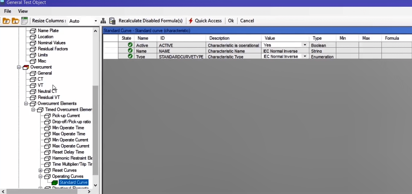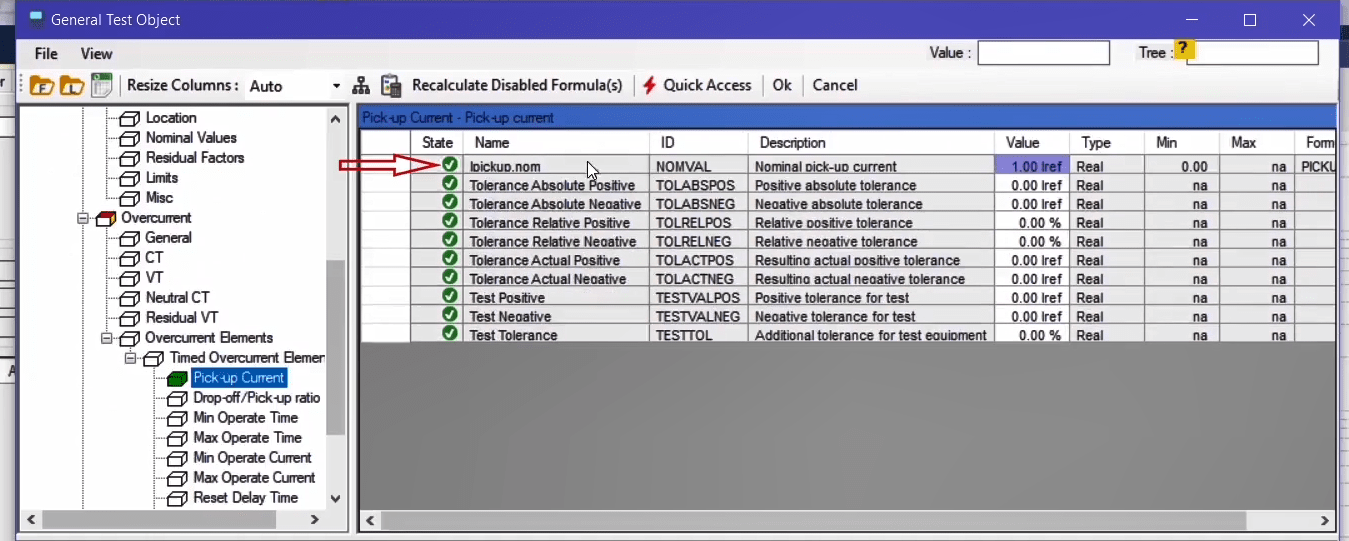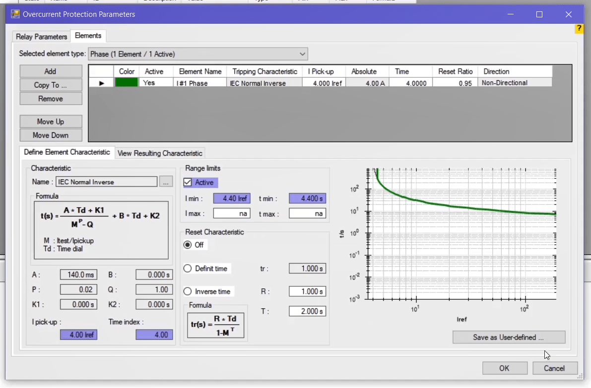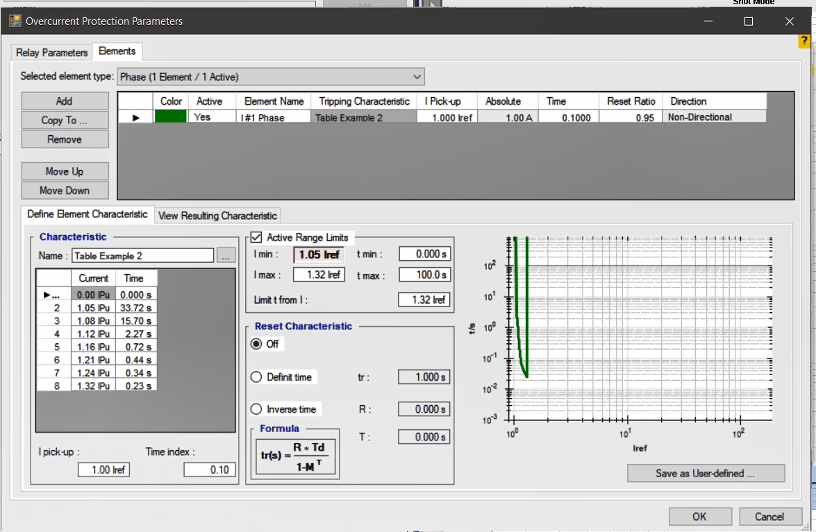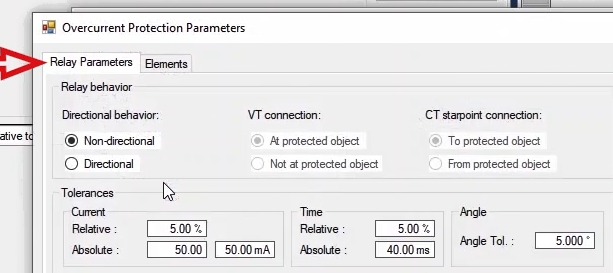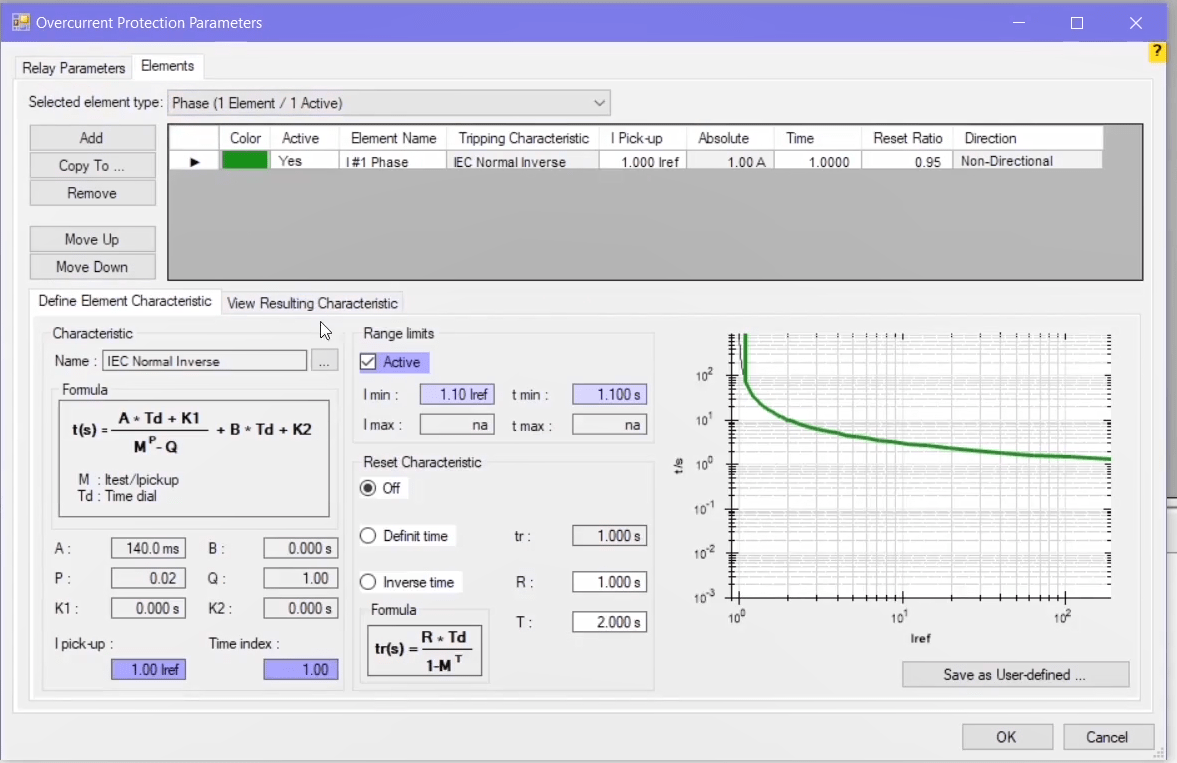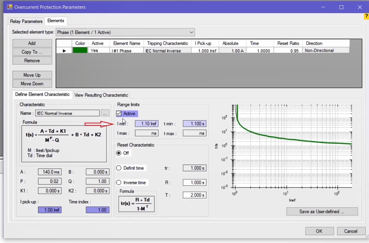 The performance range of overcurrent curves in the AMR relay starts from 1.1 regulatory current in the relay. Therefore, first, by enabling the Active Range Limits option in the Overcurrent Protection Parameters window, the Imin value is set to 1.1 Iref. In the next step, the current adjustment value for the pickup test of the current value is placed on 1.1*1=1.1 amps. This test is performed at the best possible angle in terms of relay performance i.e. -45 degrees.