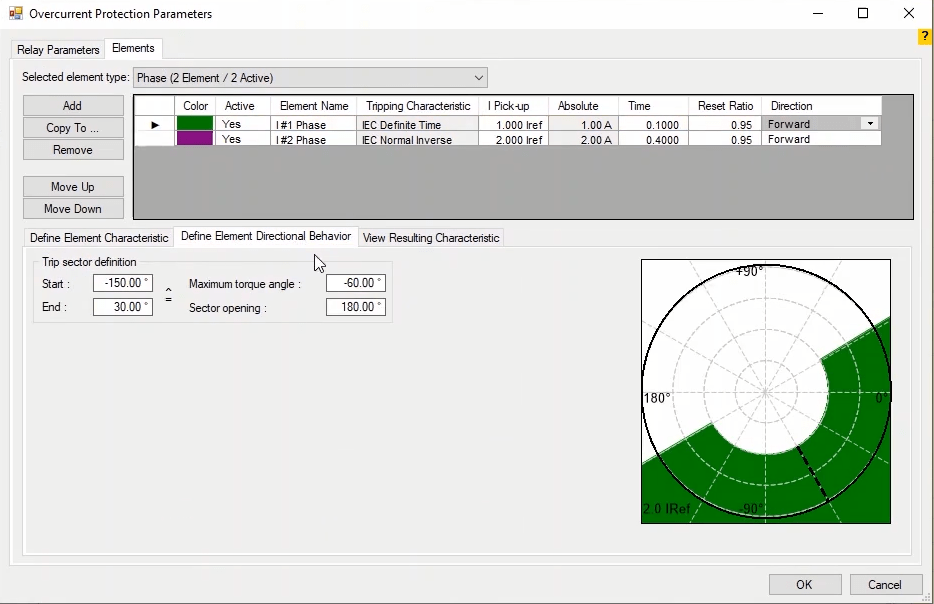 Cross Polarized method is used in AMR Vebko relay, i.e. using healthy phases to detect fault direction. For example, in case of faults in phase A, the relay uses VBC reference voltage and IA current to detect the fault current direction. The Forward or Reverse area means the part where the relay must detect the fault will be determined by the start angle and end angle.