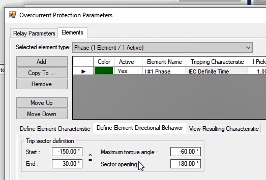 In the next step, by running AMPro software and opening the AMT Overcurrent room, it is enough to go to the Object Parameters test section and create the test characteristic after entering the information. Keep in mind that it is also possible to test this function using the Xrio file. Here, the current setting value is equal to 1 amp, TMS is 0.1. In the overcurrent test, it is required to set two parameters maximum torque angle and sector operation. To do this from the Overcurrent window and the Relay Parameters tab, the directional option is selected and from the Element tab, the Directional section is placed on forward. Then enter under the Define Element Directional Behavior tab and the maximum torque angle and Sector operation parameters are equal to -45 and 172 degrees, respectively.