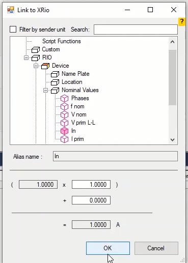 Here the differential function displayed with the name Diff is selected. In Config of this function, the signals of the current cards are connected to the differential block input. Finally, differential block output signals are assigned to Binary Outputs and relay LEDs by Output and LED blocks. You can access the settings of this function by double-clicking on the differential block.