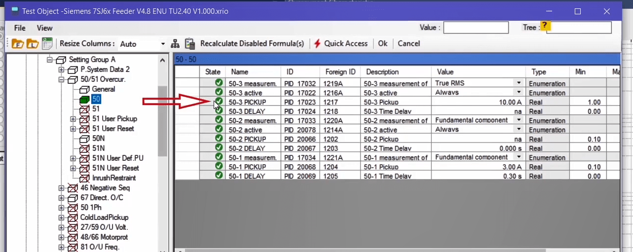 For this purpose, three states are needed for example in the first state, the normal network conditions, applied, in the second state the pickup test and in the third state the drop-off test is performed. In the second state, for pickup and drop-off test of angle, the current value will be twice the regulatory current. these states are performed in the Overcurrent room automatically by entering the settings by the user.